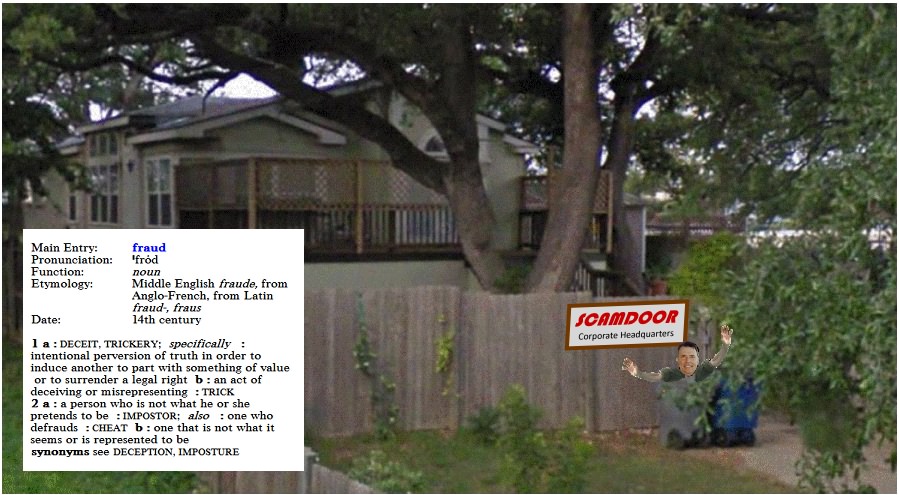 Here’s a picture of those “corporate headquarters”. Notice his greasy head sticking out of the trash can by a nice new scamdoor sign I took the